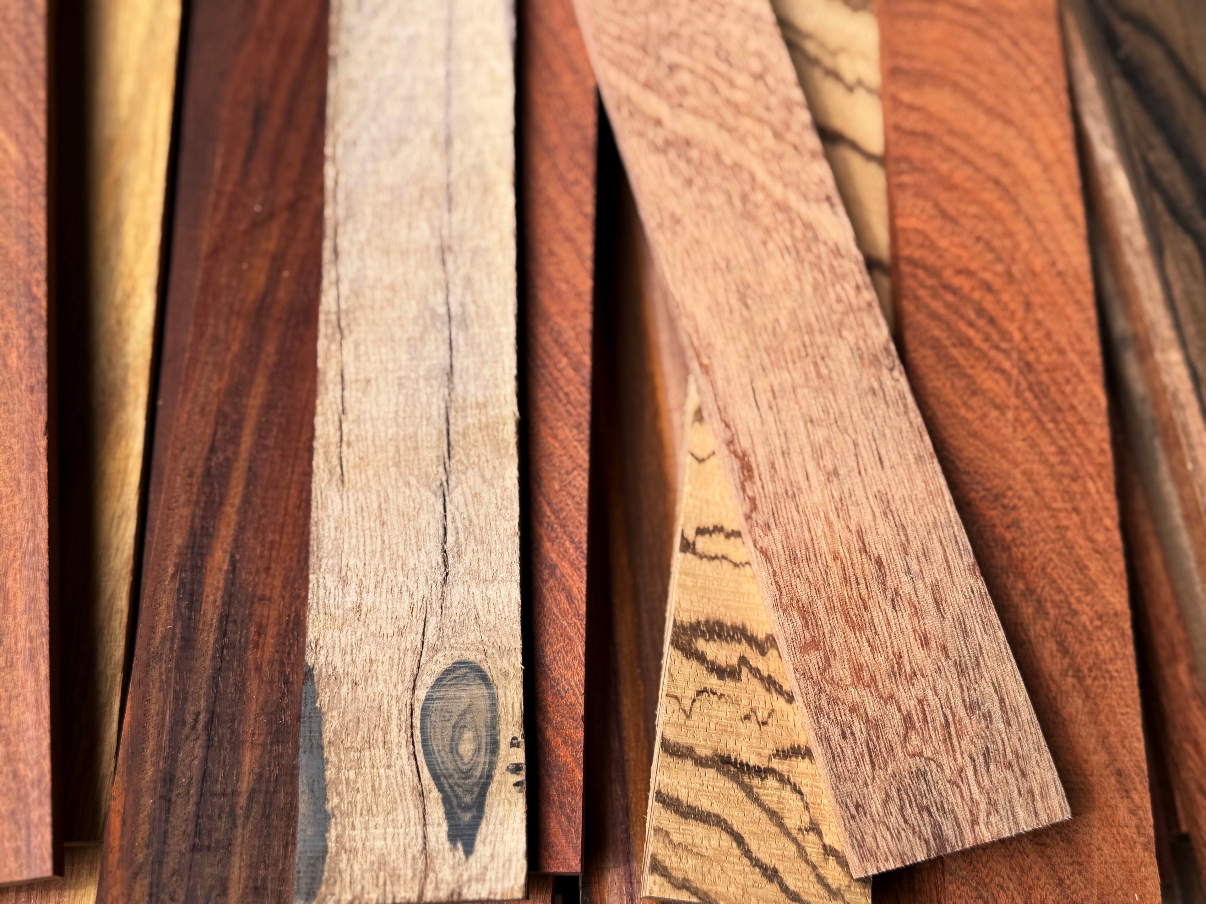 Every wood used at GW Exotic Wood is personally chosen by Gene for its strength, beauty, and character. Each species featured here is part of the current collection—some already transformed into finished pieces, others still resting in their raw form, waiting for their turn at the workbench.