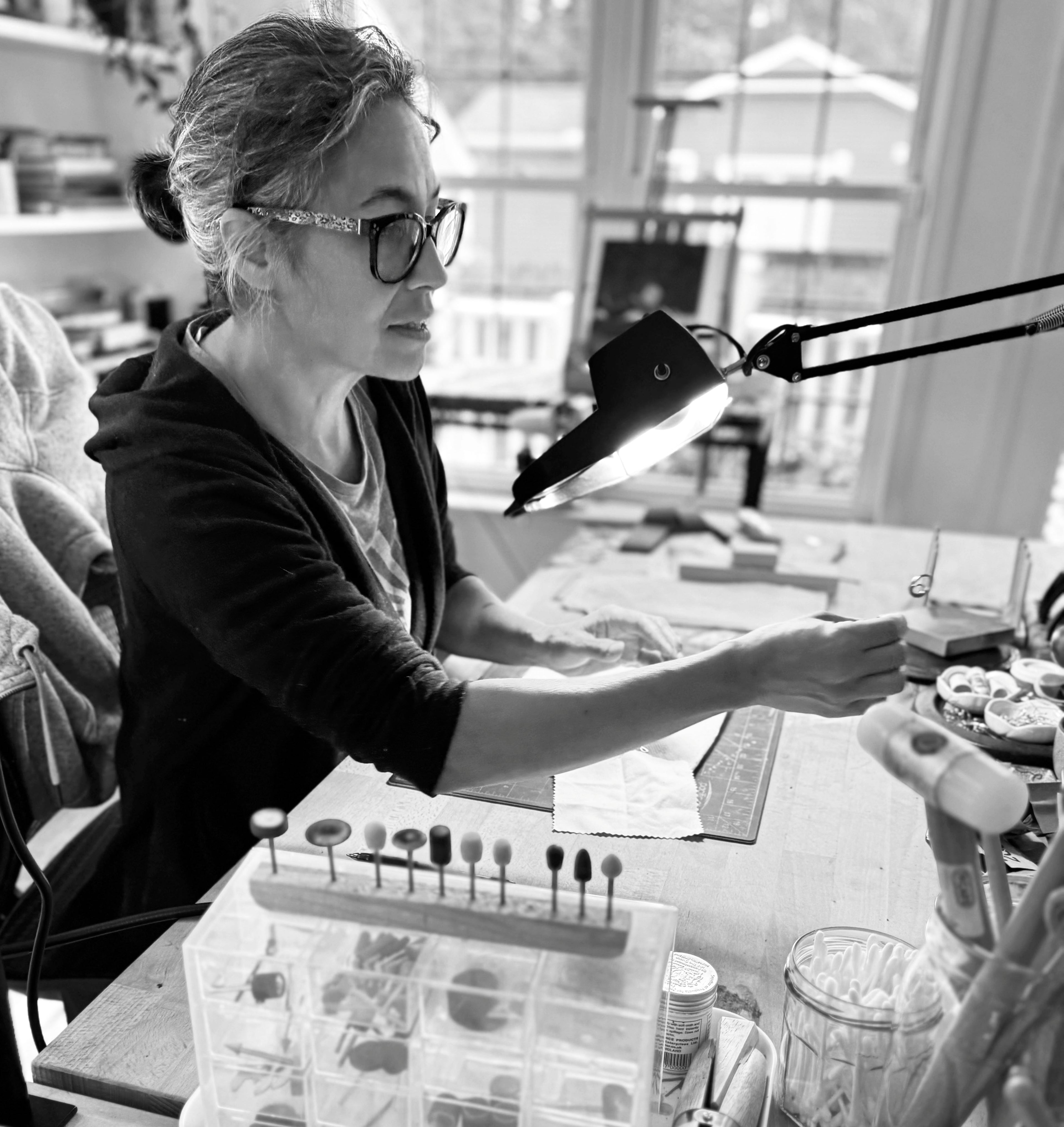 Christina grew up beside her father in his workshop, later studying fine art and developing her love of sculptural, tactile design. Today, she handcrafts the sterling silver findings that finishes each piece of jewelry.