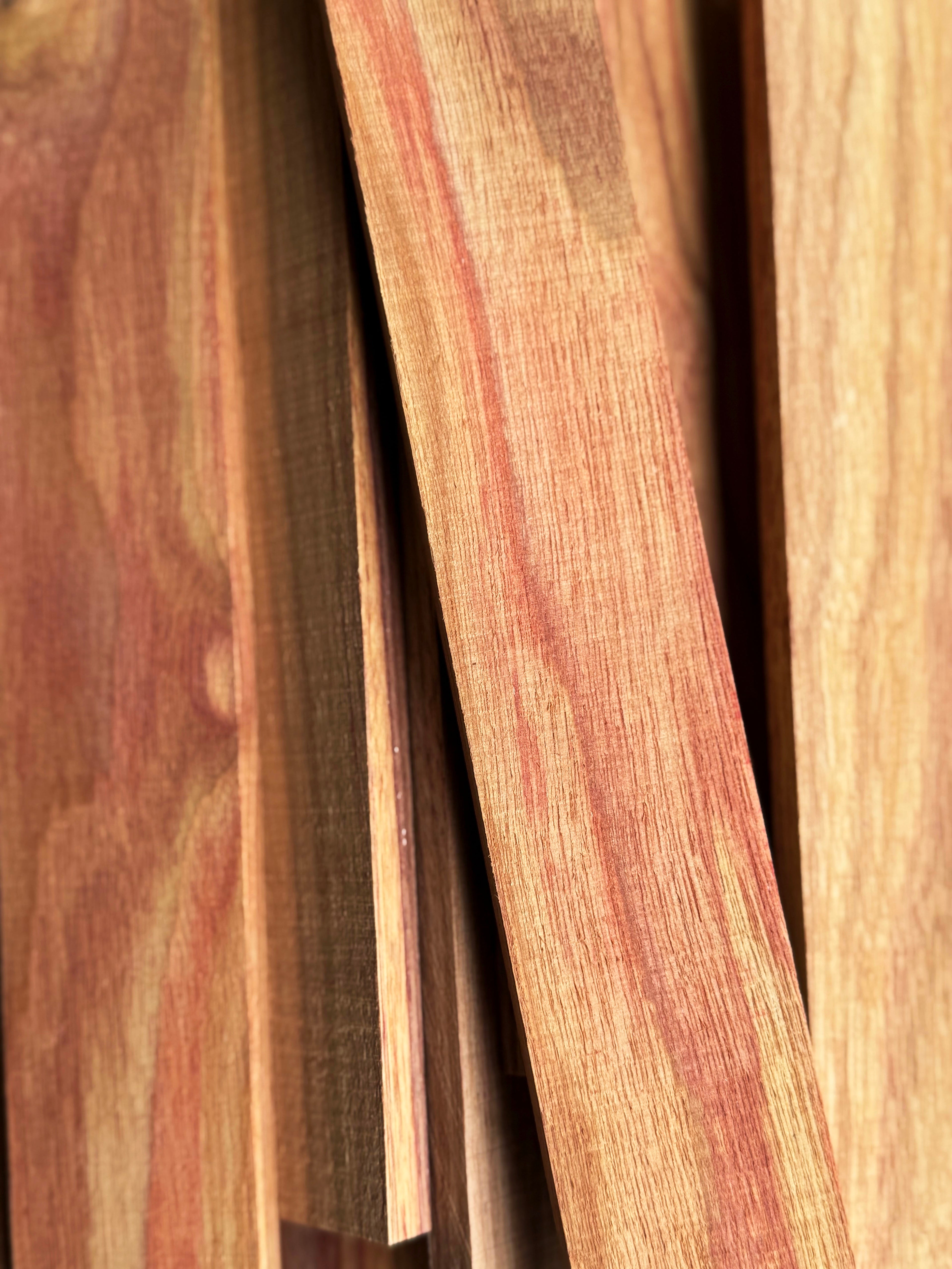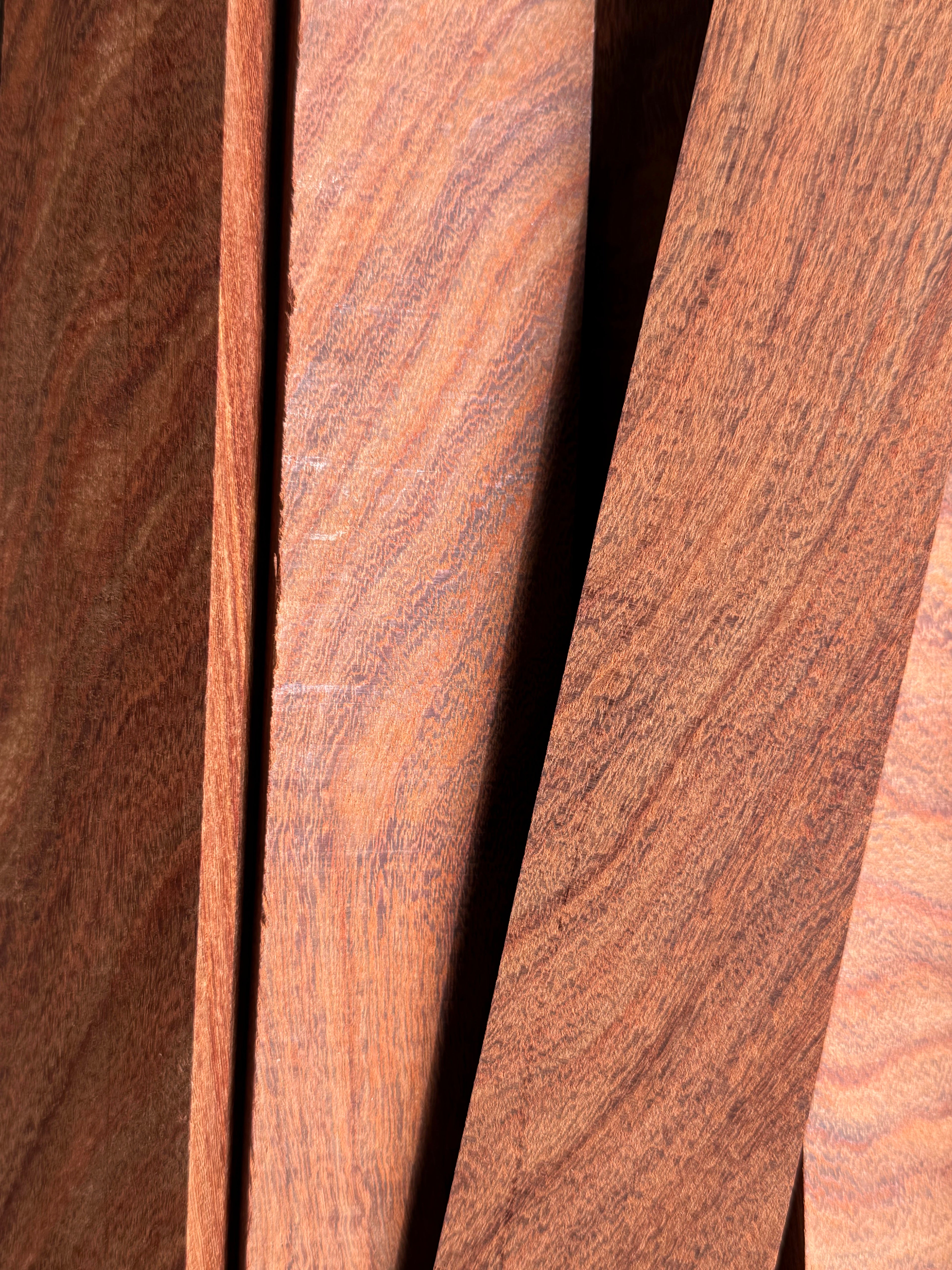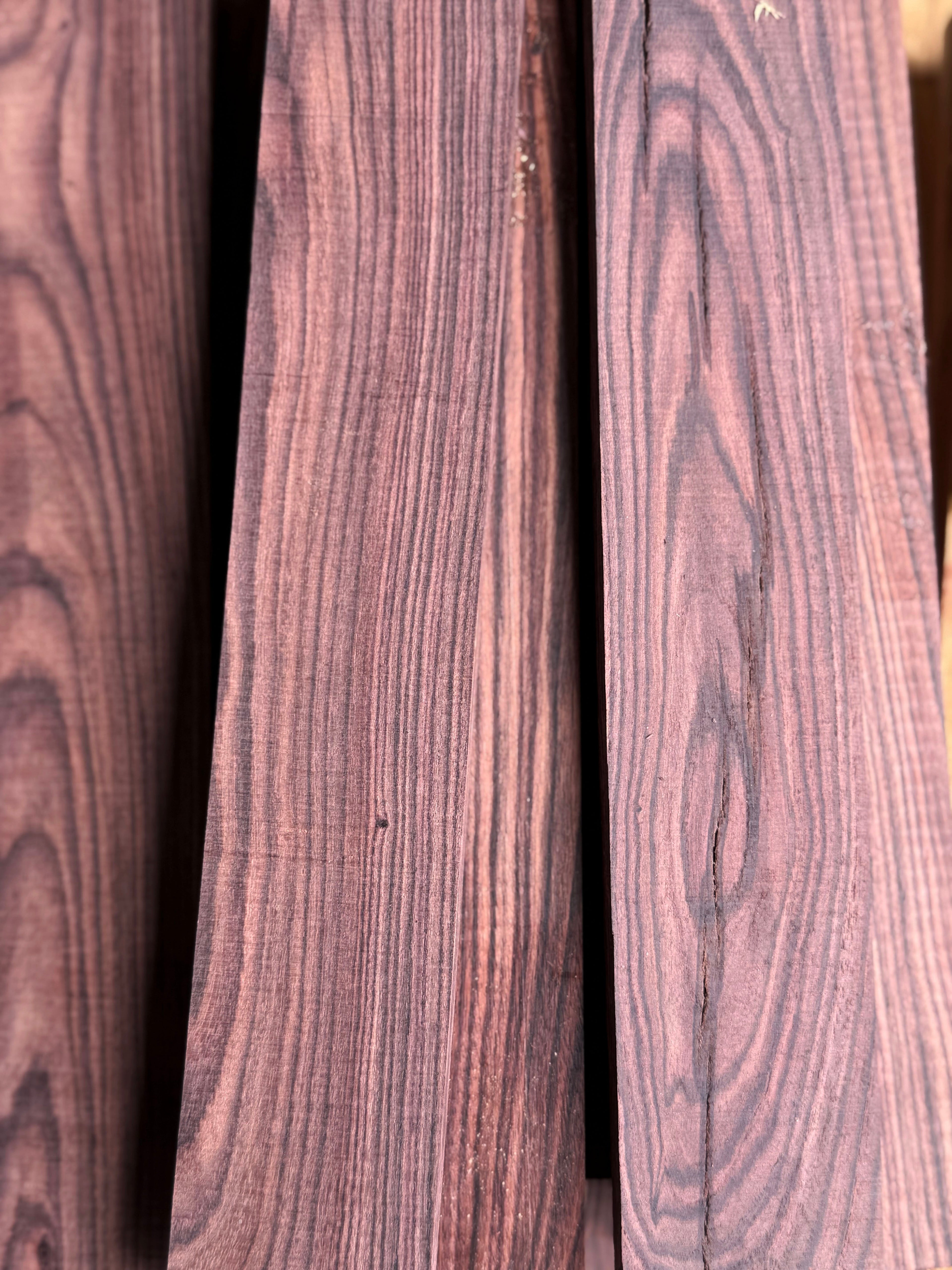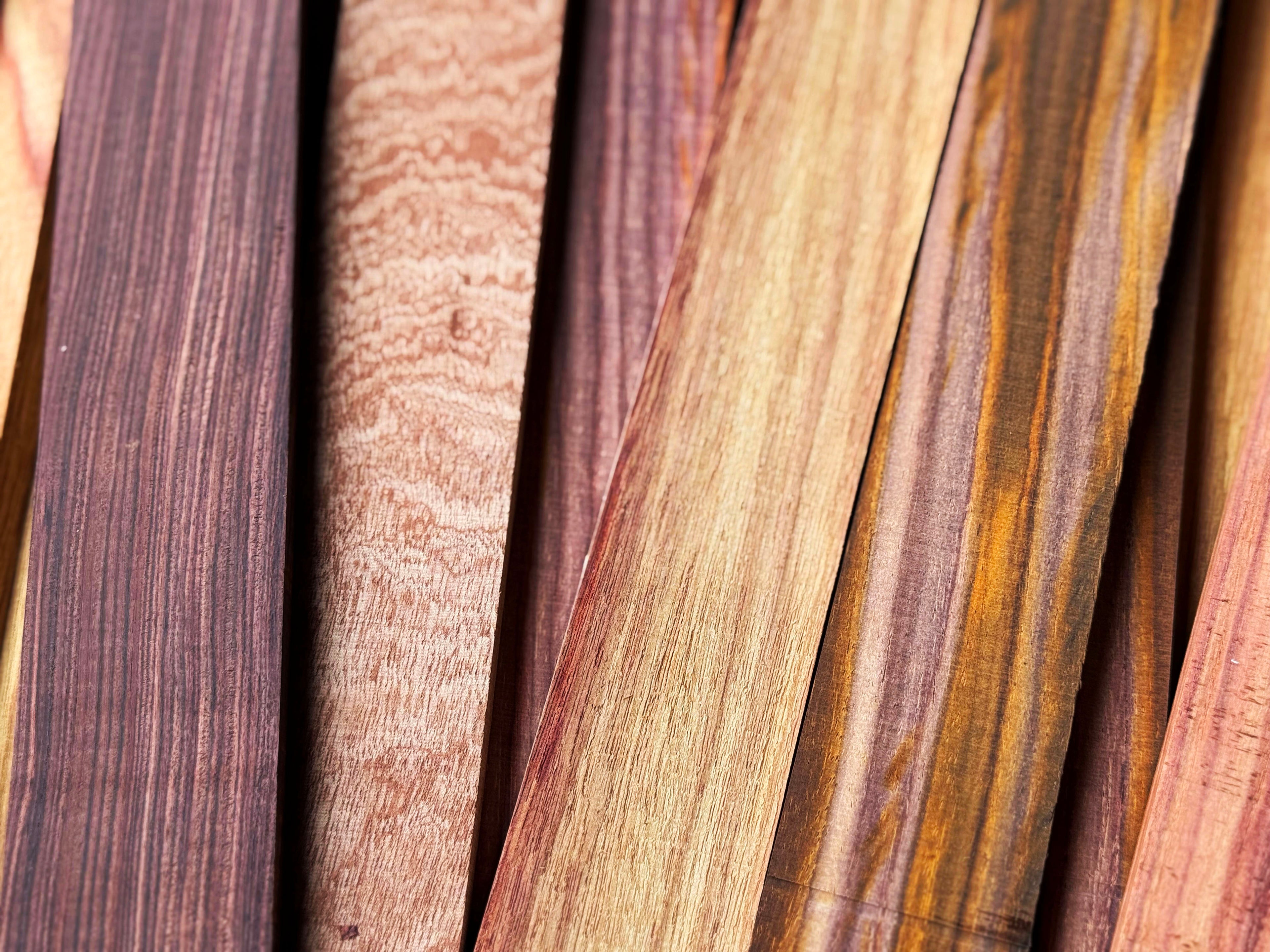 Pau Rosa (Bobgunnia fistuloides) is native to tropical Africa, especially countries such as Mozambique, Angola, and Tanzania. It is part of the legume family and is known for its rich, reddish-brown hues streaked with purples, golds, and deep ambers. The name “Pau Rosa” has also been used historically in South America, but true African Pau Rosa is distinct from Brazilian rosewoods—it has a uniquely warm, luminous tone.